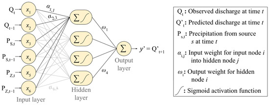 The values of W ( ω 1 , ω 2 , …, ω N h ), which were therefore defined using the training sets X and Y , are used as the calibrated values of ω 1 , ω 2 ,…, ω N h in Equation (1). As discussed by Huang et al. [44], such an approach provides the minimum training error, calculated as least-square error, for a network characterized by its number of hidden nodes and activation functions. In this work, we used ELM with the sigmoid activation function based on previous successful application on rainfall-runoff modelling [25,45], while the number of nodes in the hidden layer is considered a hyperparameter.