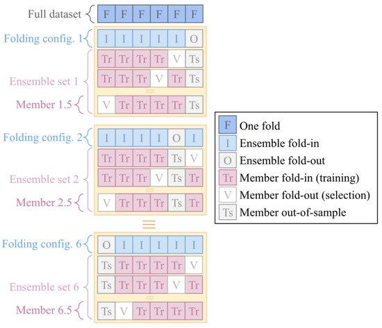 The entire dataset was randomly segmented in 6 folds (subsets) so that each possible combination of 4 folds (66.6% of the data) can be used to train one individual ML model using 1 of the other folds for testing (16.7% of the data) and the 1 remaining fold for validation (16.7% of the data). Such a data splitting schema was adopted to resemble the data distribution of 70% for training and 30% for testing/validating as commonly adopted in the literature [48,49,50]. Based on such a data division, 6 ensemble sets of ELM models were set up, each of the ensembles having a folding configuration in which 5 of the subsets are used for training its ensemble members (ensemble fold-in), and the remaining subset is reserved for testing the ensemble forecasts (ensemble fold-out, or “member out-of-the-sample”). The 5 ensemble folds-in of each folding configuration are used to fit 5 ELM models, each ELM model using 4 of the folds for producing multiple ELM model candidates (member fold-in) and the remaining fold (member fold-out) to select the trained candidate with best generalization power. A visual representation of the aforementioned data splitting is given in Figure 4.