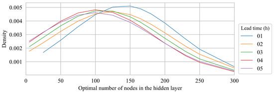 To tune the only hyperparameter of the ELM models (i.e., the number of nodes in the hidden layer), multiple ELM candidate models for each member fold-in subset were trained, each of which having a different number of hidden nodes ranging from 5 to 300. The candidate model that presented the best performance in terms of lower root mean squared error (RMSE) using the respective member fold-out is selected. The aforementioned range of explored number of nodes in the hidden layer was determined from preliminary empirical experiments based on try and error (not shown). As it can be observed in Figure 5, the mean number of hidden nodes selected as optimal are between 100 and 150 depending on the lead time to which the ML models are trained, with only a very limited portion of the models having between 250 and 300, which indicates that the range of total number of nodes explored was adequate for this problem. Each density function aggregates all individual models trained for each lead time, regardless its input set and its ensemble group.