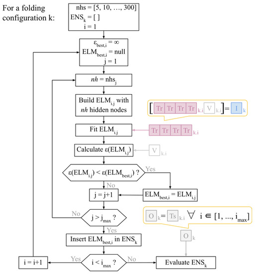Figure 6. Diagram representing the methodology for training, selecting and evaluating the ELM members of ensemble k. ε( x ) indicates the validation error of the ELM model x , nhsi indicates the i-th item in the sequence of assessed number of hidden nodes nhs., ENSk is the ensemble of models k.