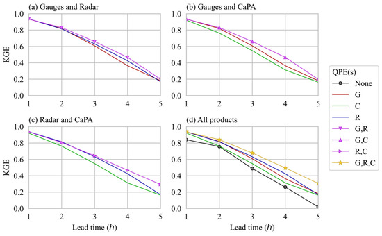 Figure 7. Mean KGE of the models that use, besides Q t L and Q t L 1 , QPE from (a) gauges and radar, (b) gauge and CaPA, (c) radar and CaPA, and (d) all of them, including the no-QPE (None) used as benchmark.