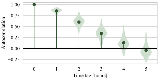 Figure 8. Correlogram of the observed discharge ( Q ) variable. Violin plots represent the distribution of values across the individual rainfall-runoff events.