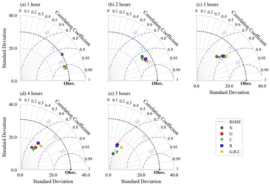 Figure 9. Taylor diagrams for the ELM models with different QPE products in their feature set at forecasting lead times ranging from 1 to 5 h (ae).