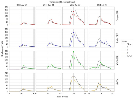 The hydrographs of four distinct high-flow events presented in Figure 10 reflect the patterns identified in the performance metrics, i.e., multi-QPEs models usually outperforming its single-QPE counterparts. One component to be highlighted is the timing: in all events except the one of 4 June 2011, the three-QPEs models was the one to earliest predict the peak, event even anticipating in one hour the maximum flow observed in one hour. Such an anticipation may eventually be considered a positive characteristic for first responders as they have more time to act.
