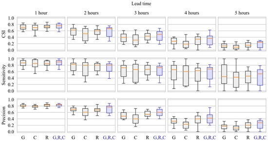 As presented in Table 4, the set of models that consider only radar data presented the lowest bias among the single-QPE group of models. Nevertheless, when all the three QPE products are used as input, a reduction in the overall bias is observed for all lead times. It worth noting, though, that all model setups are characterized as being biased low (negative bias value), a pattern that can be due to the fact that each predicted value used is the mean of an ensemble of model outputs, which tends to lead to a “smoothening” of the predictions, especially for the peak values. As improvements were also observed in other metrics, it is possible to deduce that the use of multiple QPE products resulted in an appropriate increase of the overall values predicted (higher bias value).