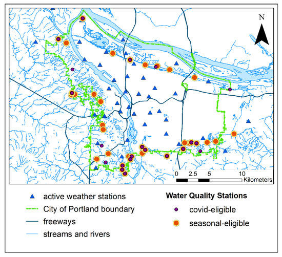 The study area is the city of Portland, Oregon, located in the Pacific Northwest region of the United States. According to Koppen’s climate classification system, the city is in a dry-summer subtropical (Mediterranean) climate. The city experiences its wet season from October to April and its dry season from May to September, and receives approximately 965 mm of precipitation annually [20]. Portland was selected for this study because the city has precipitation intensity and water quality monitoring stations while representing heterogeneous landscape patterns with different degrees of land development. Hourly rain data were collected from 32 stations that are part of the City of Portland HYDRA network [21]. Water quality data were compiled from 36 eligible stations for seasonal analysis and 21 eligible stations for the COVID-19 period. These stations qualified from the 132 stations that are a part of the Portland Area Watershed Monitoring and Assessment Program (PAWMAP) [22]. These stations were considered eligible because they had at least three samples collected across seasons and COVID-19 lockdown period, which were necessary for the statistical tests. Figure 1 shows the distribution of all the eligible stations and their placement with regards to the city’s borders and waterways. Portland’s widespread rain gauge network and its consistent monitoring of the water quality of storm runoff through PAWMAP stations provided an in-depth record of hourly precipitation going as far back as 1998 and storm runoff water samples beginning in 2015. The city’s climate patterns contribute to the interest of the investigation. Cooley and Chang [23] detected that regional precipitation in the Portland metropolitan area has been experiencing longer dry period durations paired with sporadic and more intense days of rainfall in the wet seasons. They projected this behavior to continue through the 21st century and noted that it is most noticeable at the event or monthly timescales. Access to hourly precipitation from the HYDRA network allows for an analysis of water quality fluctuations at scales as refined as storm events or as broad as the seasonal scale.