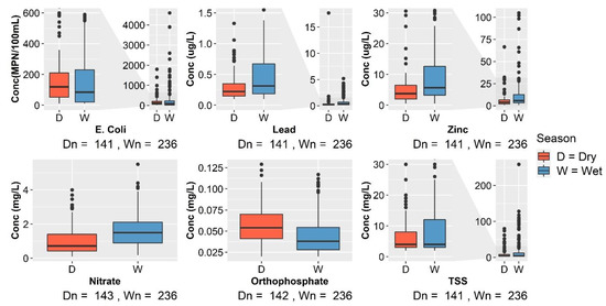 Comparing the median concentration values describes the general pollutant levels in urban storm runoff across seasons. The Mann–Whitney test showed statistically significant differences between the wet and dry seasons at the 1% significance level for E. coli, lead, nitrate, orthophosphate, and zinc. Table 1 summarizes each pollutant’s median concentration levels in the wet season and dry season. E. coli, nitrate, lead, TSS, and zinc had higher median values in the wet season than in the dry season. Orthophosphate was the only pollutant to exhibit higher median values in the dry season than in the wet season.