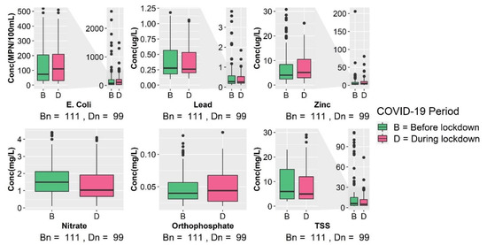 (1) Pollutant concentrations in urban runoff demonstrated pronounced differences across seasons and marginal differences with respect to COVID-19 travel restrictions. E. coli and orthophosphate experienced higher median values in the dry season, with different sources being more common during that period. Nitrate was the only element that showed statistically significantly lower amounts after the introduction of COVID-19 restrictions, most likely resulting from reduced traffic emissions due to lower driving volumes during this period.