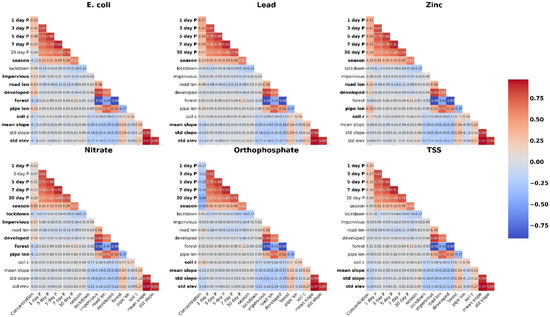 As shown in Figure 4, in nearly all cases, antecedent precipitation amounts are significantly correlated with all pollutants, although the strength of the relationship varies by pollutant. Nitrate’s correlation coefficients with all antecedent precipitation values are the lowest among all pollutants. Additionally, nitrate was the only pollutant that included the COVID-19 lockdown period as an input feature, reinforcing the findings in Table 2. Orthophosphate was the only pollutant that was negatively associated with the precipitation variables. Road length is positively associated with E. coli and zinc concentrations. Developed land and pipe length are positively related to the E. coli concentration, while forested land and soil C are negatively associated with the E. coli concentration. Topographic variables such as the mean slope, standard deviation of the slope, and standard deviation of elevation are statistically significantly related to the orthophosphate concentration.