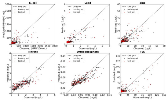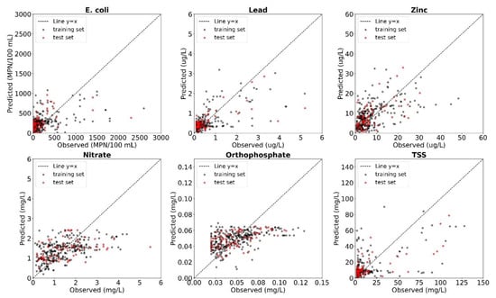 Comparing the R2 values for E. coli, the OLS model’s R2 value of 0.149 slightly outperformed the Random Forest’s R2 value of 0.13. For every other pollutant’s performance metrics, the Random Forest performed better than OLS, with lower RMSE, MAE, MAPE, values and a higher R2 value (Table 3). As shown in Figure 5 and Figure 6, the predictions made by the Random Forest are more clustered by the line of identity (Y = X). This fit is desired, as all the performance metrics calculate the total error from the predictions and their actual ground-truth values.