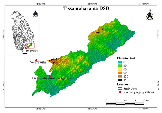 This study was carried out focusing on Tissamaharama Divisional Secretariat Division (DSD) located in the Hambantota district of the Southern province of Sri Lanka, covering a 421 km2 area. The area receives an average annual rainfall of about 950–1100 mm, and the average temperature of the area ranges from 27 to 32 °C. Two main rivers flow through this area: Kirindi Oya and Manika Ganga. The Weerawila tank, Tissa tank, and Yoda tank are the largest surface water reservoirs in the study area. When we consider the land use, most parts of Tissamaharama DSD are covered with forests and croplands, and the topography of the area consists of mostly flat terrain where the elevations are less than 30 m from the mean sea level (MSL). The location and the topography of the study area are illustrated in Figure 1.