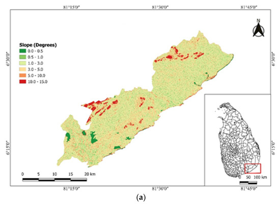The spatial variation of slope and drainage density of the Tissamaharama DSD is illustrated in Figure 6a,b, respectively. The maximum slope was observed in the range of 10°–15°. The slope parameter gives a clear idea of the terrain features of the Tissamaharama area. A major part of the study area has a flat terrain with slopes of less than 3°.