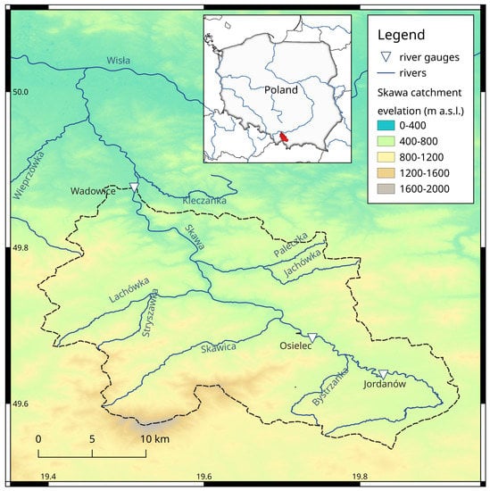 The Skawa River to Wadowice gauge station has catchment area of 835 km (Figure 1). The mean annual runoff at Wadowice gauge station from years 1961–1997 equals 12.7 ms, with mean annual flood runoff 242 ms [42]. This high ratio confirms mountainous characteristic of Skawa catchment from hydrological perspective. According research of [42], in the last century the minimum annual water stage of Skawa River at Wadowice station has lowered by more than 2 m. It is related to the erosion of the river bed and should not be understood as a decrease in flows.