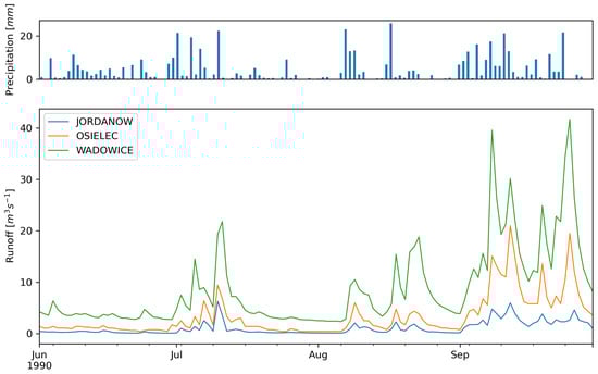 Sample data used in presented research—daily precipitation and daily runoff at three cross-sections of Skawa River in summer 1990.