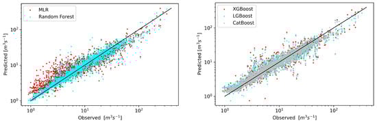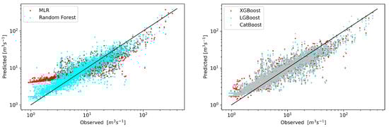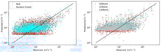 In the second scenario, only the upstream runoff data from the Osielec cross-section was used. The Figure 6 shows a significant improvement, except for the MLR model, which significantly increases the values for low flows. This is consistent with the observation of [52] that XGBoost outperforms SVM model not only in forecasting low flows, but also in high flows in terms of MARE, NSE and R.