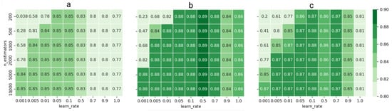 In the last stage of the analysis, optimization of hyperparameters was carried out. Selection of the appropriate hyperparameters of by grid-search and cross validation is time-consuming process [52]. As practice shows, with such a large number of parameters as in the XGBoost model, it may turn out that the obtained results are worse than those generated using the default parameters. It is clearly visible on the attached heatmaps (Figure 7), where for certain combinations of parameters the results are significantly worse than the results before optimization.