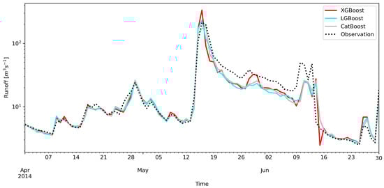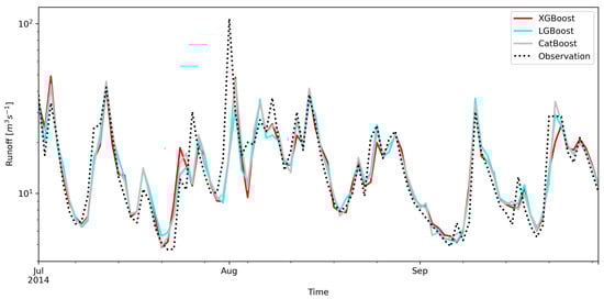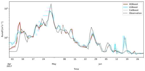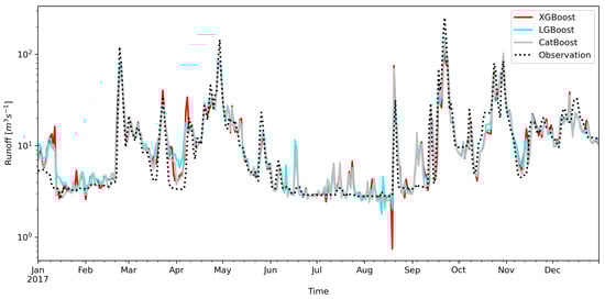 High flows are usually underestimated by all models. With the XGBoost model, the greatest deviations from the observations can be noticed. The tested models have similar problems with mapping some events, e.g., the beginning and middle of 2017 (Figure 9). For unknown reasons, the flow predicted by XGBoost is overestimated here for high flows and underestimated for low flows. The middle of August 2017 is particularly interesting, where the XGBoost forecast is very different from the other models.