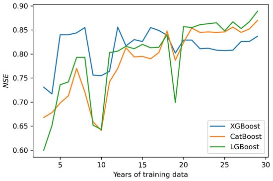 For three years of training data (Figure 13) NSE is in the range between 0.60 and 0.74 for LGBoost and XGBoost respectively. For the CatBoost and LGBoost models, you can see a significant and consistent improvement in performance, with NSE approaching 0.90. The XGBoost model is the fastest to get good results, but beyond five years of training data, its NSE is virtually unchanged. We can clearly see the deterioration of the performance of all models at 10 years and then a significant deterioration of the performance of the LGBoost model at 19 years of data. This means that the models, and LGBoost in particular, are sensitive to training data. After exceeding 12 years of training data, the models behave relatively stable. It can therefore be assumed that in the case of such forecasts, this would be the recommended minimum period for model training.