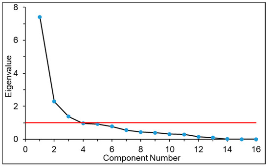 FA is a data reduction technique that was explained mathematically by Lawley and Maxwell [39]. FA reduces many inter-dependable variables into a smaller number of new variables without losing their original characteristics. R-mode FA [37], which investigates the relationship between the variables inside the samples, including principal component analysis (PCA), was conducted on standardized data to reveal the interactions between the 16 variables. The components with eigenvalues higher than and very close to 1 were kept for the present study (Figure 3). The variance of the first four principal components was maximized by applying the varimax normalized rotation. Factor loading values >0.7 are considered as a significant contribution toward the components of this study. FA was performed by using the pschy package of R programming in this study.