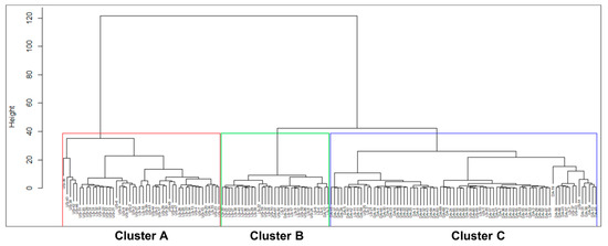 Three clusters were defined based on the visual inspection of the produced dendrogram. The phenon line was drawn at a linkage distance of around 40 in this study to obtain the most desirable clusters. Thus, the samples having a linkage distance <40 were grouped within the same cluster. Three major clusters, named cluster A, cluster B and cluster C, were defined based on the position of the dendrogram of the groundwater samples. The number of clusters on the dendrogram could be lessened or enhanced by shifting the phenon line up and down [43]. In this study, grouping the groundwater samples into three major clusters was the optimal threshold for forming geochemically distinct clusters.