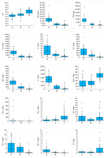 Box and whisker plots of individual variables were plotted to see the variation in chemistry in the different clusters (Figure 6). These plots revealed that the three clusters were also geochemically different. The EC and concentrations of Na+, K+, Mg2+, Cl−, SO42− and NO3− decreased from clusters A to C. In contrast, the pH and concentrations of HCO3−, NO3−, PO43− and Br− increased from clusters A to C. EC in groundwater exceeding 1000 µS/cm is generally considered as an indication of seawater invasion [44]. In this sense, clusters A and B, having median ECs of 12,531 µS/cm and 2790 µS/cm, respectively, would indicate the presence of seawater, but the high salinity in these waters was due to the infiltration of dissolved evaporate salts at the ground surface by monsoon precipitations when the groundwater level is low. Cluster C with a median EC of 1000 µS/cm indicated fresh groundwater. High pH and HCO3− in cluster C compared with clusters A and B indicated carbonate minerals (mainly calcite) dissolution that enhanced both the Ca2+ and HCO3− concentrations in the groundwater. However, Ca2+ was replaced by Na+ due to the cation exchange reaction when CaHCO3-type water intruded in a saline water body by freshening, as explained in previous studies by Sarker et al. [9,10]. For this reason, the water type in cluster C was dominantly NaHCO3. On the other hand, the relatively high Ca2+ and Mg2+ and low pH and HCO3− were due to the infiltration of dissolved salt crests in a previously fresh aquifer and reverse cation exchange reaction. The existence of some CaCl- and CaMix-type waters in the LSA supported the argument and shallow waters were also mostly coded as negative cation exchange. High NO3− and low FeTotal and MnTotal in cluster C (compared with clusters A and B) indicated an oxidizing redox environment. Cluster C contained water mostly from the DA. The recharge of the DA was completely different from that of the shallow aquifers. DA was recharged in the northwestern part of Bangladesh. Relatively high MnTotal and FeTotal and low nitrate in the groundwater samples from clusters A and B indicated reducing conditions. The shallow aquifers were locally recharged, where the oxidation of OM lowered the redox potential. This explained the high contents of FeTotal and MnTotal in clusters A and B. Therefore, the FeTotal and MnTotal enrichment in the groundwaters from clusters A and B could be explained by the following reactions (Equations (6) and (7)), where ferric oxyhydroxides and manganese oxide can be reductively dissolved via the oxidation of OM: