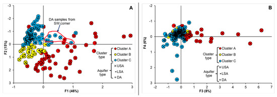 The projection of sampled wells on the factorial (F1–F2) plane (Figure 8A) revealed that the F1 axis showed the opposite behaviour between the fresh (cluster C) and highly to moderately mineralized waters (cluster A and B). Most of the highly mineralized groundwaters belonged to cluster A on the positive side of factorial plane 1. The groundwaters from cluster B appeared to have moderately mineralized groundwaters on the negative side of factorial plane 1 and the positive side of factorial plane 2, indicating a mixing environment. Cluster C, which contained mostly fresh groundwaters, was on the negative side of F1, F2, F3 and F4 (Figure 8A,B). Some of the water samples from the DA in cluster C fell on the positive side of F1 and the negative side of F2. These water samples in the SW corner of the investigated area were paleo-seawater samples.