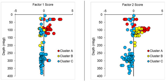 The distribution of water samples with depth against the factor scores of the three different clusters of groundwater related to factors 1 and 2 is shown in Figure 9. Note that depth is not included as one of the variables. The distribution diagrams show that almost all the groundwaters from cluster A down to 125 m in depth had positive factor scores. The majority of the groundwaters from cluster B around 95 m to 200 m in depth for factors 1 and 2 had negative and positive scores, respectively. The majority of groundwaters of cluster C were of fresh sodium bicarbonate type. This group of water was characterized by relatively low mineralized water with high pH and HCO3−. These groundwater samples had negative scores for factors 1 and 2 and were dominating at larger depths. Some of the groundwaters in between 250 and 300 m in depth from cluster C had positive scores for factor 1, suggesting the existence of highly mineralized water. Highly mineralized waters below 250 to 300 m depth at the SW corner of the investigated area indicate paleo-seawater [45].