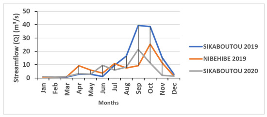 Of the two gauging stations in the catchment area, data were collected for 2019 from the Nibéhibé station and for 2019–2020 from the Sikaboutou station.