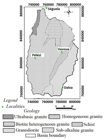 The geological formations of the basin belong mainly to the Precambrian basement (Middle Precambrian) and are grouped into two main entities: magmatic rocks that are mainly composed of granite and metamorphic rocks composed of schist [17]. The magmatic rocks encountered are plutonic and volcanic types. They are essentially made up of the granitoids that are found throughout most of the catchment area. In the study area, migmatites and schists are geological formations that represent metamorphic rocks lodged mainly in the riverbeds (Figure 3). In the Lobo catchment area, a composite aquifer is formed by weathering aquifers (superficial) and fractured aquifers (deeper). Saprolite aquifers develop in sandy clay formations and granitic arenas. Fissured aquifers underlying weathering aquifers form important reservoirs [18].