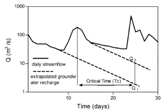 where R is the recharge for the streamflow peak (m3), Q1 is the groundwater discharge at the critical time (Tc) (m3/day), and Q2 is the groundwater discharge at Tc (m3/day).