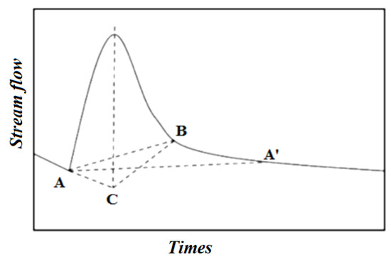 Based on the assumption that direct and hypodermic flows (simply called runoff) are combined, linear methods allow the separation of runoff from base-flow by identifying the start and end points of runoff directly on the hydrograph. This method involves joining points A and B by a straight line, as in Figure 7. Point A corresponds to the beginning of a rising phase of the hydrograph, and point B corresponds to the inflection point of the receding phase. This point is determined by the intersection formed after extending the recession and drying curves, which are linear when a logarithmic transformation of the ordinate axis is applied. The base-flow rate is calculated by connecting the starting point of a rainfall event to the point of inflection on the declining part of the event, with the area under the curve representing the base-flow rate [24].