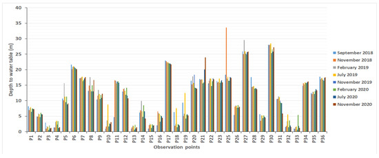 The groundwater direct recharge estimated by the water table fluctuation method depends on the maximum (November) and minimum (February) groundwater levels for the period (2018–2020). Figure 9 shows the variation in groundwater levels in the observation wells in the Lobo catchment. Analysis of the various piezometric records shows a rapid variation in the water table during the rainy season and a rapid drop during the dry season in all the boreholes in the study area. Overall, the water table changed very little during the study period, except for a few boreholes that experienced increases of up to 3 m. In the Lobo catchment, the water table can be very sensitive to direct recharge by rainfall due to its shallow depth.