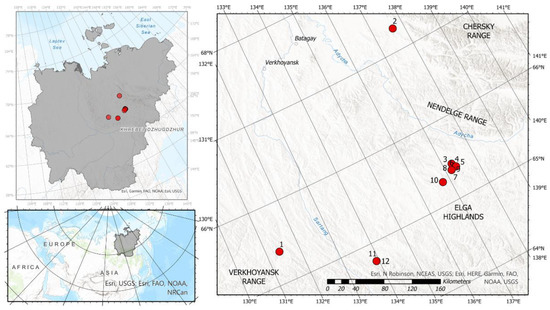 Location of sampling points in the Verkhoyansk Range system; numbers correspond to Table 2.