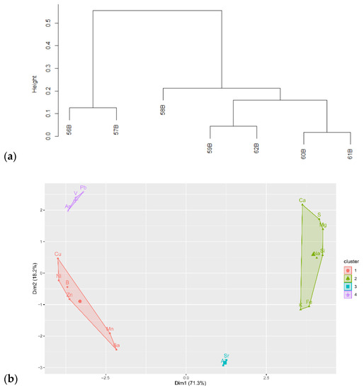 Statistical analysis was performed in RStudio [80], a graphical interface for R language [81]. Hellinger-transformed absolute element contents were used to calculate Bray-Curtis dissimilarity using vegdist() function from the package ‘vegan‘ [82]. Agglomerative clustering of water samples was done using agnes() function from the package ‘cluster’ [83], and elements clustering was done using fviz_cluster() function from the package ‘factoextra’ [84].
