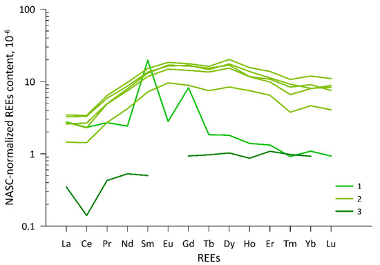 The NASC-normalized REEs distribution in sampled waters is highly regional, showing three distinct patterns in relative abundance of light (LREEs) and heavy (HREEs) rare earth elements (Figure 5). The Dulgalakh River sample, Region 1, is depleted in HREEs, as shown by high LaN/ErN = 2.1, LaN/YbN = 2.5, and shows unexpected Sm and Gd peaks: positive Sm anomaly SmN/SmN* = 7.3, and positive Gd anomaly GdN/GdN* = 4.0, calculated according to [86,87], respectively. Here and below, subscript N refers to NASC-normalized values, and * designates a ‘natural’ baseline REE concentration, against which the anomaly is calculated. All samples from Region 2 plot around the same pattern, with high HREEs content, LaN/ErN and LaN/YbN below 0.4, low content and negative Ce anomaly: CeN/CeN* = 0.6…0.7, according to [87]. In common between these two patterns is a negative Tm anomaly [88], TmN/TmN* = 0.65…0.75 (Figure 5). In contrast, the Dogdo River sample, Region 3, shows significant depletion in LREEs, with LaN/ErN = 0.32, LaN/YbN = 0.38. A pronounced negative Ce anomaly is found, CeN/CeN* = 0.4, and Eu content below detection limits, which could also imply its negative anomaly.