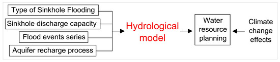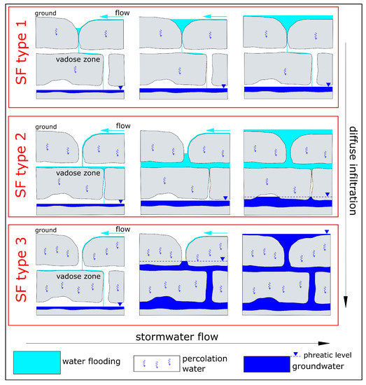 Despite SFs being essential for groundwater balance, they are still difficult to foresee and manage [29,30]. They occur as consequences of extreme precipitation when: (1) the rate of stormwater flow exceeds the discharge capacity of the sinkhole (SF type 1); (2) the underground karst system is unable to drain the entire stormwater flow (SF type 2); (3) the groundwater level rapidly rise especially because of the diffuse infiltration (SF type 3) [3,31] (Figure 1).