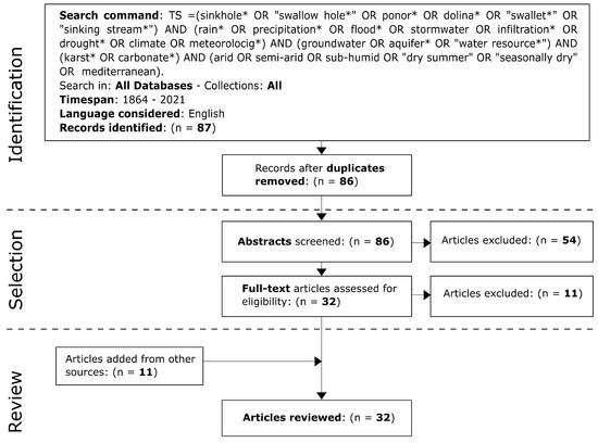 WoS engine allowed the identification of 87 records, only one of which was excluded as duplicate (Figure 2). The selection of Stage 2 has determined the exclusion of 54 articles for being apparently irrelevant to the review purpose and belonging to different subject areas (i.e., ecology, hydrobiology, geomorphology, sinkhole occurrence, regional hydrogeology, karst hydrochemistry, baseflow estimation, particles transport, paleoclimate, civil engineering, pollution impact, vulnerability assessment, rainfall chemistry, mathematical model). Despite the positive evaluation of the abstracts, eleven out of thirty-two articles were then excluded by the full-text assessment of the Stage 3 (Appendix A). These exclusions were caused by the irrelevance of the article on the sinkhole flooding process, or because the article deals with cases of humid regions (Table A1). Eleven articles identified by other sources (examination of the bibliography of the selected articles; personal literature knowledge; use of common search engines) have been added for the review analysis. Finally, a total of 32 articles were reviewed.