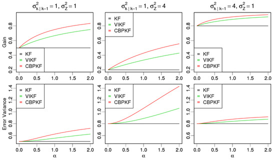 Comparison of gain and filtered error variance among KF, the VIKF approximation, and CBPKF.