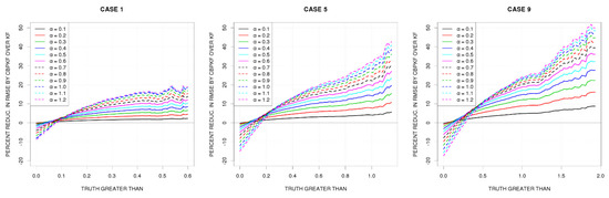 Percent reduction in RMSE by CBPKF over KF for a range of values of for Cases 1 (left), 5 (middle), and 9 (right).