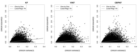 If the filtered error variance is unbiased, one would expect the mean of the actual error squared associated with the variance to be approximately the same as the variance itself. To verify this, we show in Figure 3 the filtered error variance vs. the actual error squared for KF (left), the VIKF approximation (middle), and CBPKF (right) for all ranges of filtered error variance. For reference, we plot the one-to-one line representing the unbiased error variance conditional on the magnitude of the filtered error variance and overlay the local regression fit through the actual data points using the R package locfit [35]. The figure shows that all three provide conditionally unbiased estimates of filtered error variance as theoretically expected, and that the VIKF approximation and CBPKF results are extremely similar to each other.