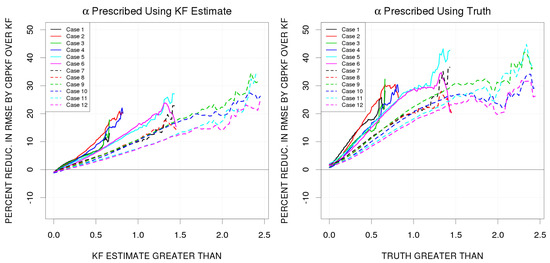 Percent reduction in RMSE by adaptive CBPKF over KF in which is prescribed using the KF estimate (left) and the truth (right).