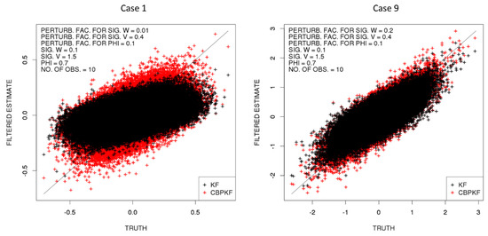 where denotes the multiplicative CB penalty factor for CBPKF at time step k, denotes some norm of the KF estimate at time step k, and denotes the proportionality constant. Figure 4(left) shows the RMSE reduction by adaptive CBPKF over KF with for the 12 cases in Table 2 m = 1 and n = 10. The values used were 3.0, 1.0, and 0.5 for Groups 1, 2, and 3 in Table 2, respectively. The figure shows that adaptive CBPKF performs comparably to KF in the unconditional sense while substantially improving performance in the tails. The rate of reduction in RMSE with respect to the increasing conditioning truth, however, is now slower than that seen in Figure 2 due to the occurrences of incorrectly specified α. To assess the uppermost bound of the feasible performance of adaptive CBPKF, we also specified with perfect accuracy under Equation (51) via where denotes the true state. The results are shown in Figure 4(right) for which the values used were 3.0, 1.5, and 1.0 for Groups 1, 2, and 3 in Table 2, respectively. The figure indicates that adaptive CBPKF with perfectly prescribed greatly improves performance, even outperforming KF in the unconditional sense. Figure 4 suggests that, if can be prescribed more accurately with additional sources of information, the performance of adaptive CBPKF may be improved beyond the level seen in Figure 4(left). Finally, we show in Figure 5 the example scatter plots of the KF (black) and adaptive CBPKF (red) estimates vs. truth. They are for Cases 1 and 9 in Table 2 representing Groups 1 and 3, respectively. It is readily seen that the CBPKF significantly reduces CB in the tails while keeping its estimates close to the KF estimates in normal ranges.