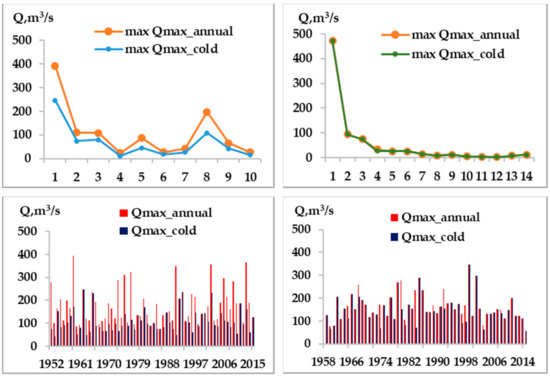 Comparison of the long-term maximum winter and annual floods in the upper Steyr (top left) and the upper Rika (top right) catchments. Labels of symbols refer to ID number in Table 1 (upper Rika) and Table 2 (upper Steyr), bottom left—Steyr River—Klaus an der Pyhrnbahn, bottom right—Rika River—Mizhhiria.