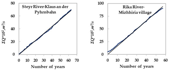 The analysis of the mass curves of the winter floods for all 24 catchments indicates that the series of observations are homogeneous. Two examples of mass curves for the largest catchments are shown in Figure 3. The plots demonstrate that the shape of mass curves does not show any significant unidirectional deviations in the 60 and 70 years.