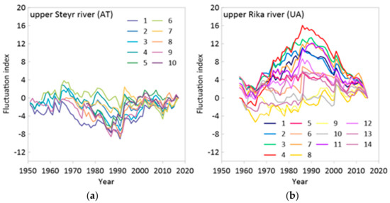 A previous study [28] examined flood fluctuations in many rivers in Ukraine and identified four different types of long-term fluctuations. Our results for the upper Rika catchments mostly belong to the first type characterized only by two simple phases: decreasing and increasing. The fluctuations found for the upper Steyr catchments are close to the fluctuations found for the Tysa River. These fluctuations are characterized by a smaller number of cycles with shorter duration and smaller amplitude than found in the upper Rika catchment. In future studies, it will be interesting to analyze the flood fluctuations across larger geographical transects to examine further factors and drivers controlling their variability.