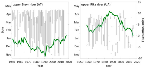 The seasonality of winter floods of both regions is presented in Figure 5. The left and right panels show the occurrence of winter floods in the upper Steyr and upper Rika catchments, respectively. The green lines indicate the winter flood fluctuations for the largest catchments in both regions (ID = AT1, ID = UA1). The results show that the variability of flood occurrence in individual years is larger in the Austrian than in the Ukrainian catchments. The variability is mainly related to the larger topographical variability of Austrian catchments. The earliest occurrence of winter flood maxima in the upper Steyr catchment is observed mostly at Klaus an der Pyhrnbahn gauge, which is the main outlet. The latest occurrence is typically observed in the highest catchment (Polsterlucke, ID = AT10) and the difference between the occurrence of flood maxima between the catchments in individual years can exceed 3–4 months. The largest floods in Austrian catchments tend to occur in November/December. In the upper Rika River, the inter-annual variability of flood occurrence is also large, but the variability between the catchments is notably smaller than in Austrian catchments. Interestingly, the smallest between-catchment variability is observed between 1985 and 1995, which is the start of the main fluctuation decline. During this period, most of the floods occur in November/December.