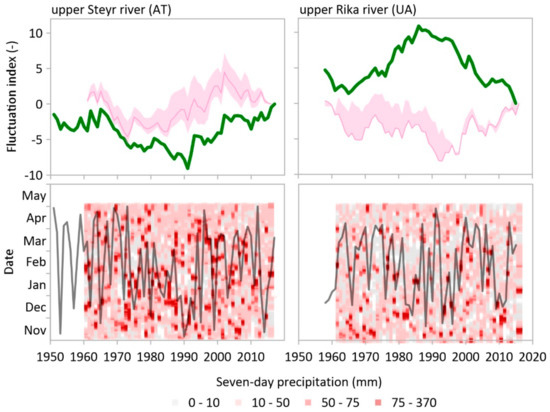 Fluctuations (top panels) and seasonality (bottom panels) of the winter maximum seven−day precipitation in the upper Steyr and the upper Rika catchments. Variability in maximum precipitation (pink band in left top panel) is plotted for all sub-catchments in the upper Steyr catchment. For Mizhhiria station in the upper Rika River (top right panel), the pink band indicates the variability between precipitation observations at three (Mizhhiria, Nyzhnii Studenyi, Verkhnii Bystryi) climate stations (Table 4). The green line indicates the fluctuation index of the winter floods (top panels). Bold lines (bottom panels) represent the season of the maximum precipitation in each year.