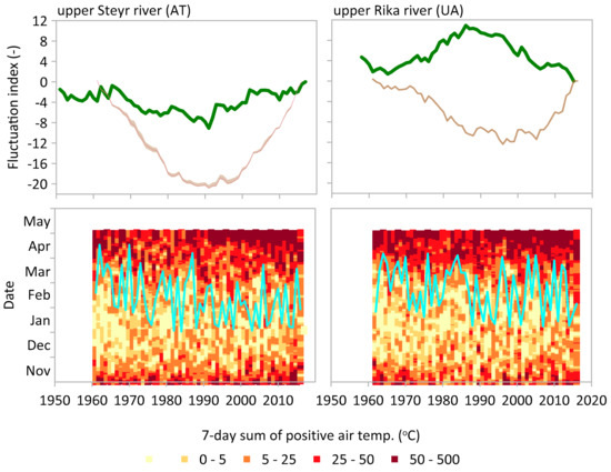 Fluctuations (top panels) of the sum of positive air temperature and seasonality (bottom panels) of the seven−day melt index in the upper Steyr and the upper Rika catchments. Variability in the sum of positive air temperature (brown band in left top panel) is plotted for all sub−catchments in the upper Steyr catchment and Mizhhiria station in the upper Rika River (top right panel). The green line indicates the fluctuation index of the winter floods (top panels). Bold lines (bottom panels) represent the seasonality of the snowmelt index, i.e., the first full seven days in a year when surface air temperatures exceed 0 °C.