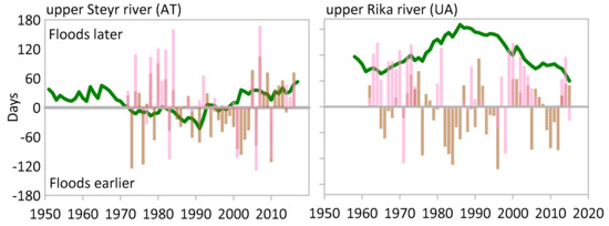 The difference between the occurrence of floods and the occurrence of maximum precipitation and start of the melt season is examined in Figure 8. The positive and negative values indicate the later and earlier occurrence of floods than the occurrence of maximum winter precipitation (pink bars) and melt start (brown bars), respectively. Figure 8 shows that in the upper Steyr catchment, the positive phase of flood fluctuations (after 2000) occurs when the flood occurrence coincides with the occurrence of maximum winter precipitation. The stable phase in the 1970s is associated with floods occurring in March and April, but the maximum precipitation occurred in the beginning of winter. The same pattern is observed in the upper Rika catchment. The peak of positive phase (i.e., mid-1980s and 1990s) is characterized by a coincidence of floods and maximum precipitation.