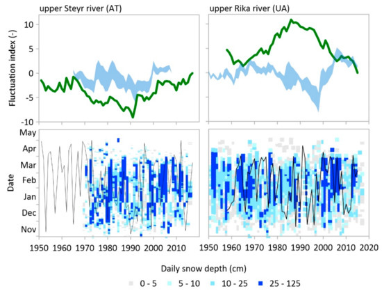 The fluctuations of annual maximum daily snow depth are presented in Figure 9. In the upper Steyr catchment, the maximum snow depth fluctuations follow the fluctuations in winter floods. The periods of increasing or decreasing phases correspond to the phase of flood fluctuations. In the upper Rika catchment, the snow depth fluctuations are very stable in 1950–1980 and do not follow the increasing phase of the winter floods fluctuations. However, the decreasing phase of snow depths from the mid-1980s until the end of the 1990s corresponds with decreasing flood magnitudes in this period. The increase in snow depth from the beginning of the century (2000) is also reflected in a slight rise in winter flood magnitudes. The seasonality of annual snow depth maxima also has a strong inter-annual variability. Earlier snow depth maxima are associated with lower snow depth magnitude and typically smaller winter floods.